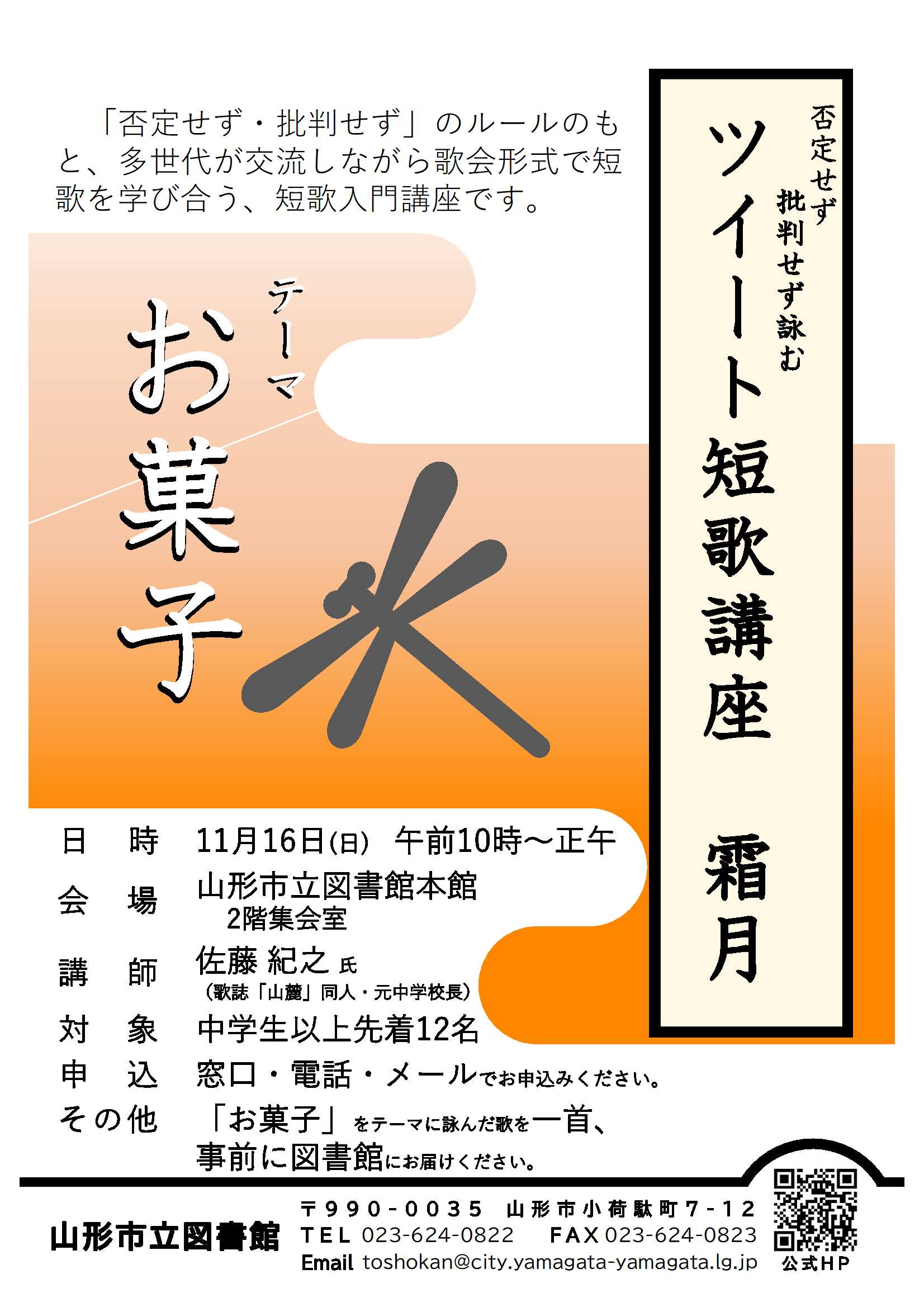 詳細内容 | 「否定せず・批判せず」のルールのもと、多世代が交流しながら歌会形式で短歌を学び合う、入門講座です。 初心者の方をはじめ、短歌に興味のあるかたのご参加をお待ちしています! 「お菓子」をテーマに詠んだ短歌を1首、名前と連絡先明記して、11月12日(水曜)までに図書館本館に持参、メールまたはファックスでお送りください。 また、見学のみも可能です。 |