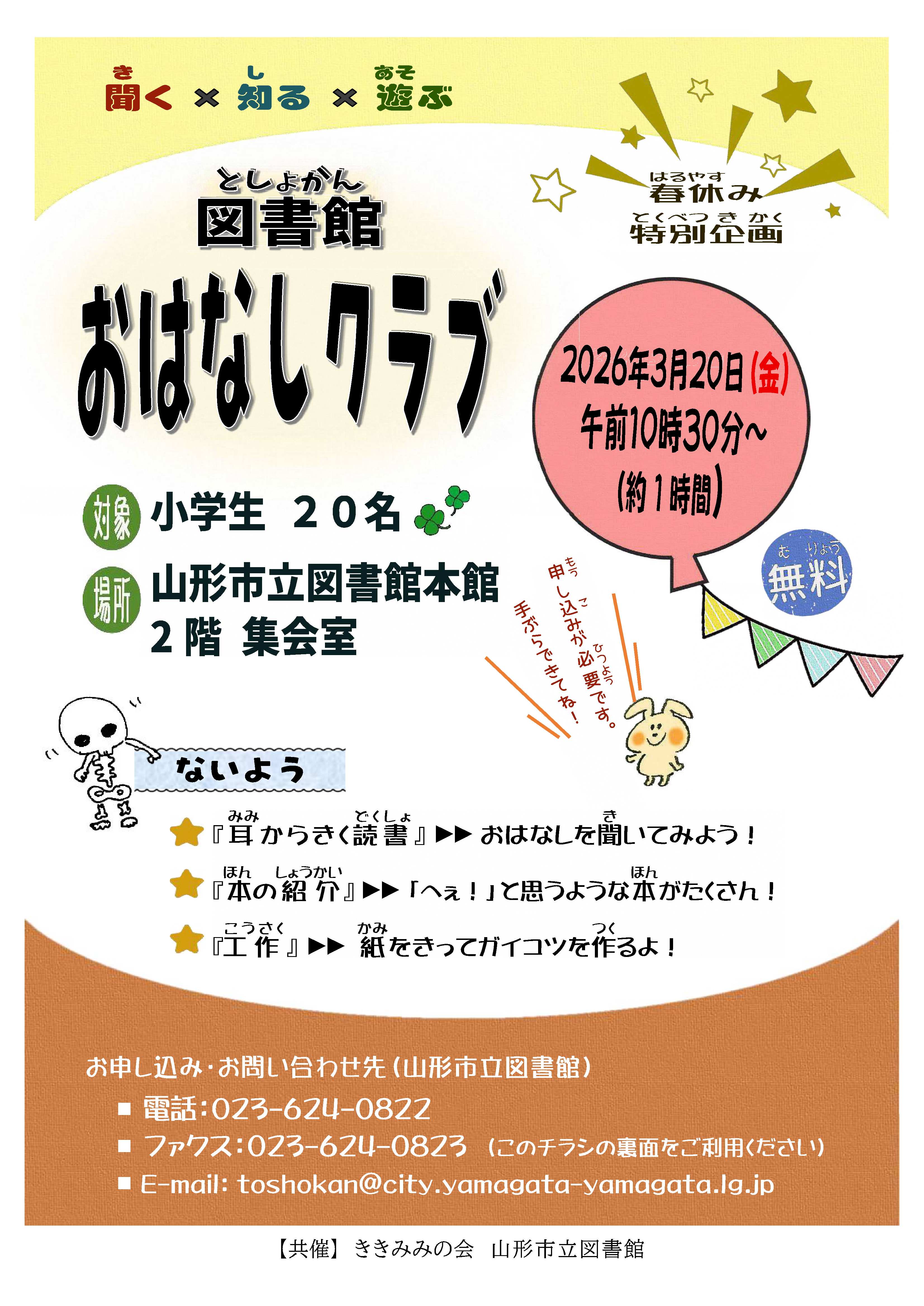 | 申込み | 2月25日(水曜)から窓口・電話(023-624-0822)・メール( toshokan@city.yamagata-yamagata.lg.jp)でお申し込みください。 |