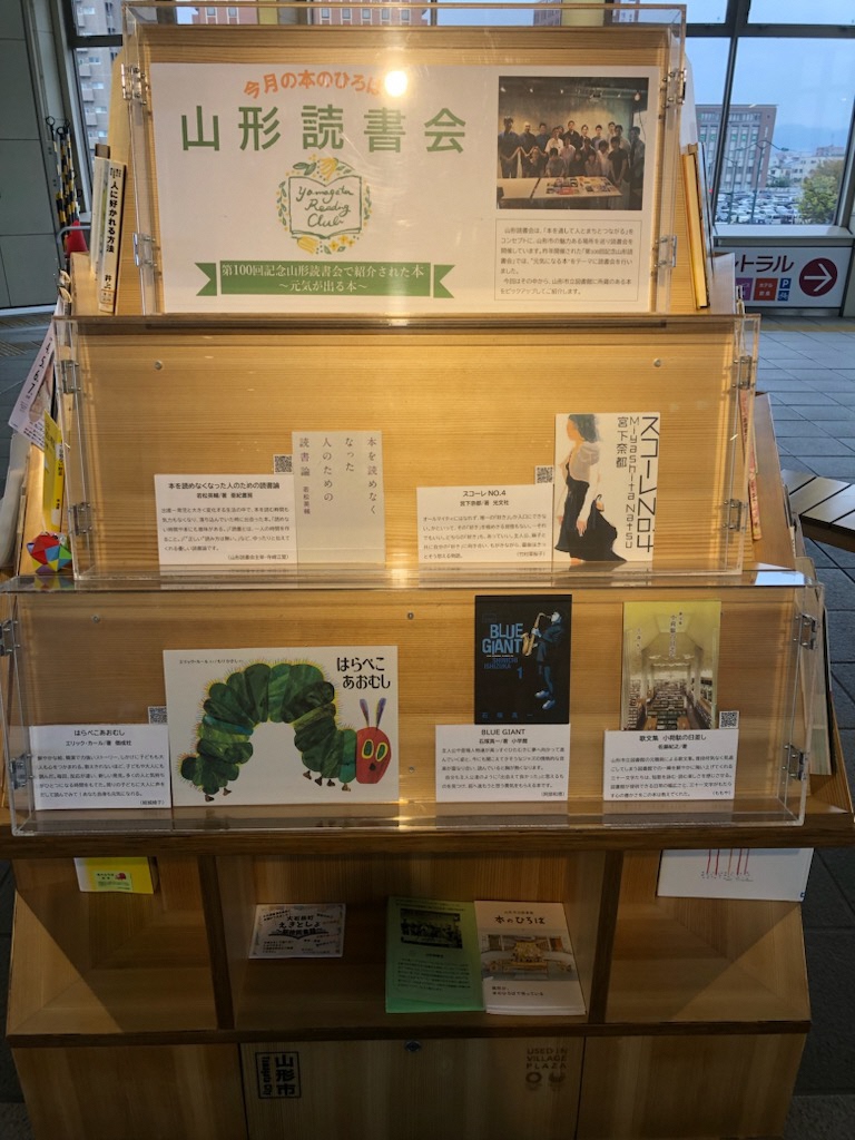 山形読書会が選ぶ『第100回記念山形読書会で紹介された本 元気が出る本』を展示しています。