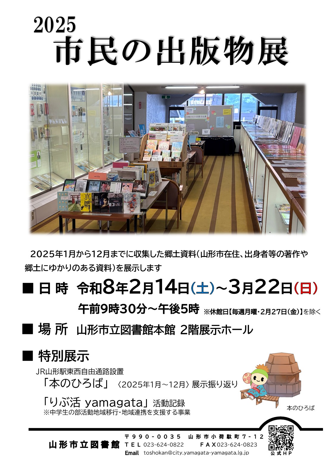 | 詳細内容 | 2025年1月から12月までに収集した郷土資料(山形市在住、出身者等の著作や郷土にゆかりのある資料)を展示します。 また、以下の特別展示を行います。 ・「本のひろば」 2025年1月から12月までの展示振り返り ・「りぶ活yamagata(※)」の活動記録 ※令和6年度から実施している中学生の部活動の地域移行・地域連携を支援する事業 |